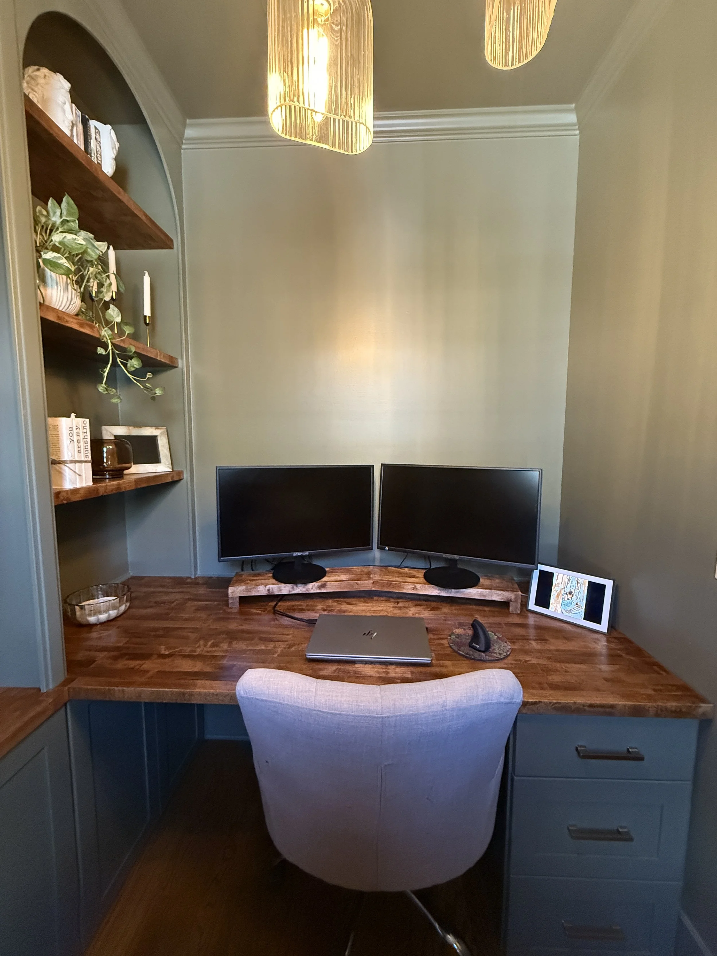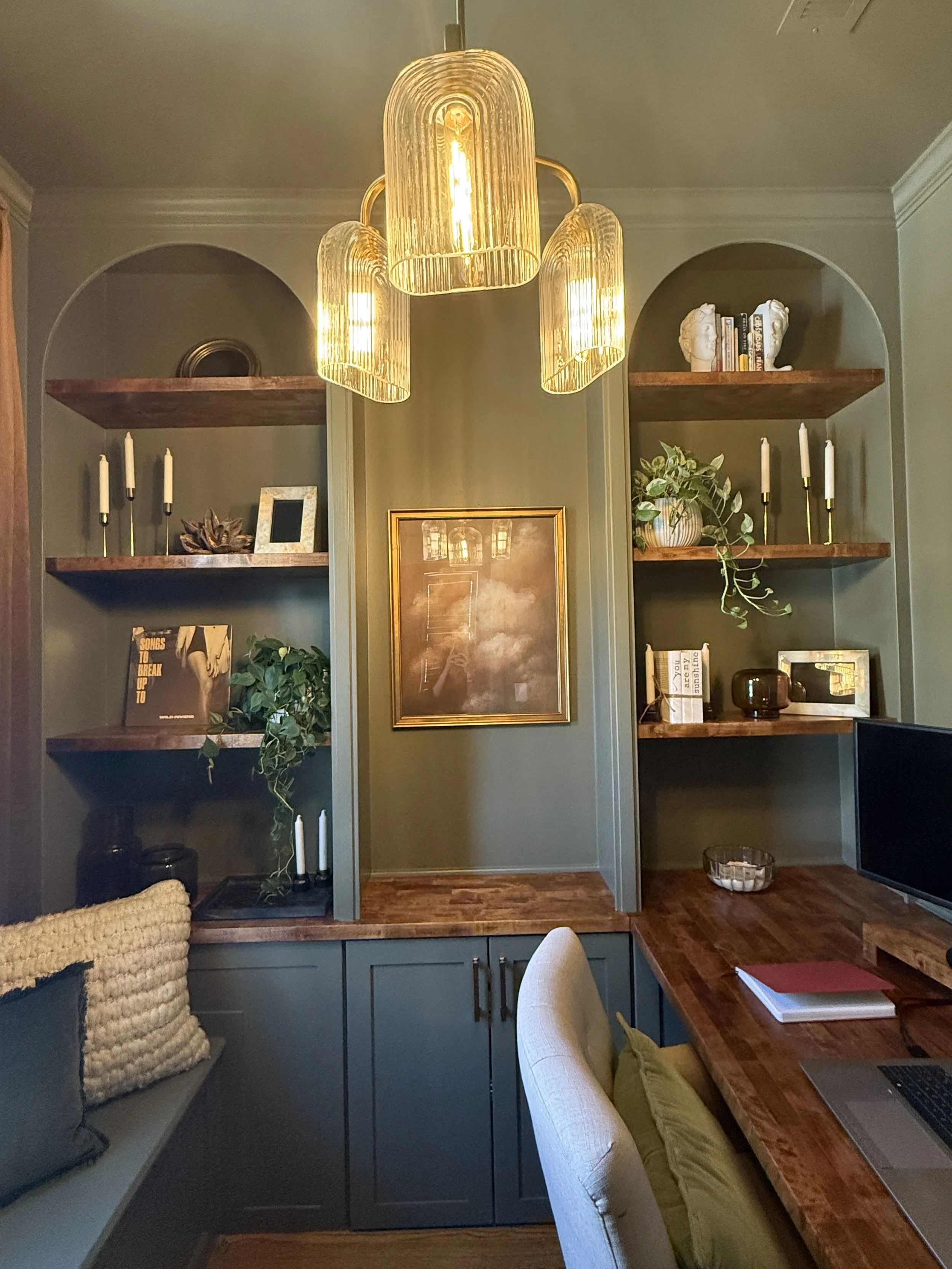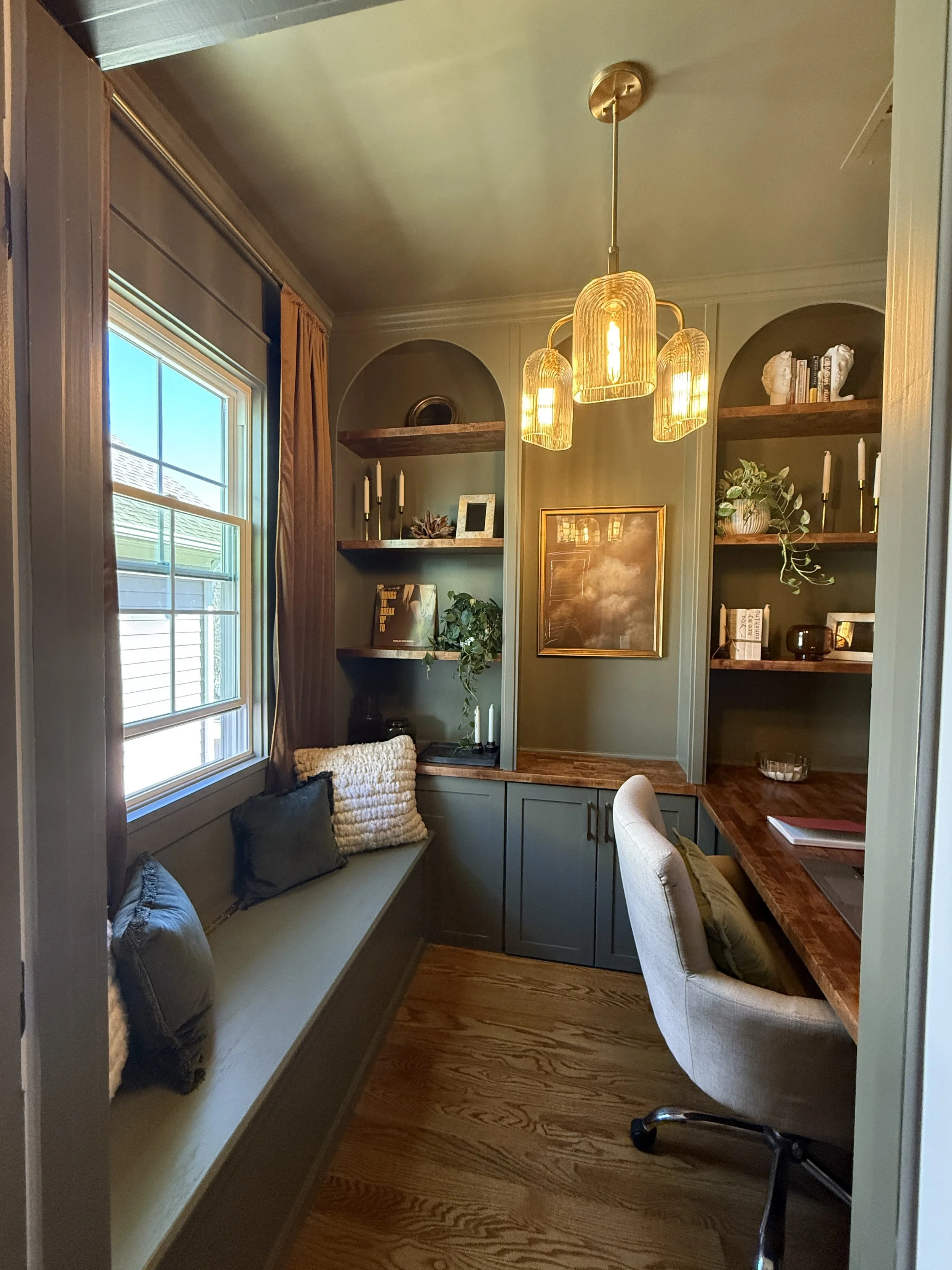 What was once a standard walk-in closet is now a cozy, functional workspace featuring custom built-ins, rich wood finishes, and elegant lighting. We turned unused space into a refined home office retreat—perfect for focus and style.